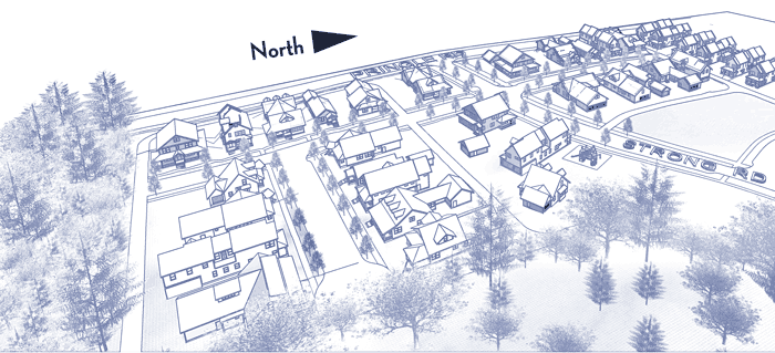 I'm pretty sure "our" lots are in the bottom left. You can see that The Woods' 14 acres wraps around two sides of the corner lot, as also shown in the other map. The street in front of the lots ends in a cul-de-sac. No garages would face the street, just front porches.