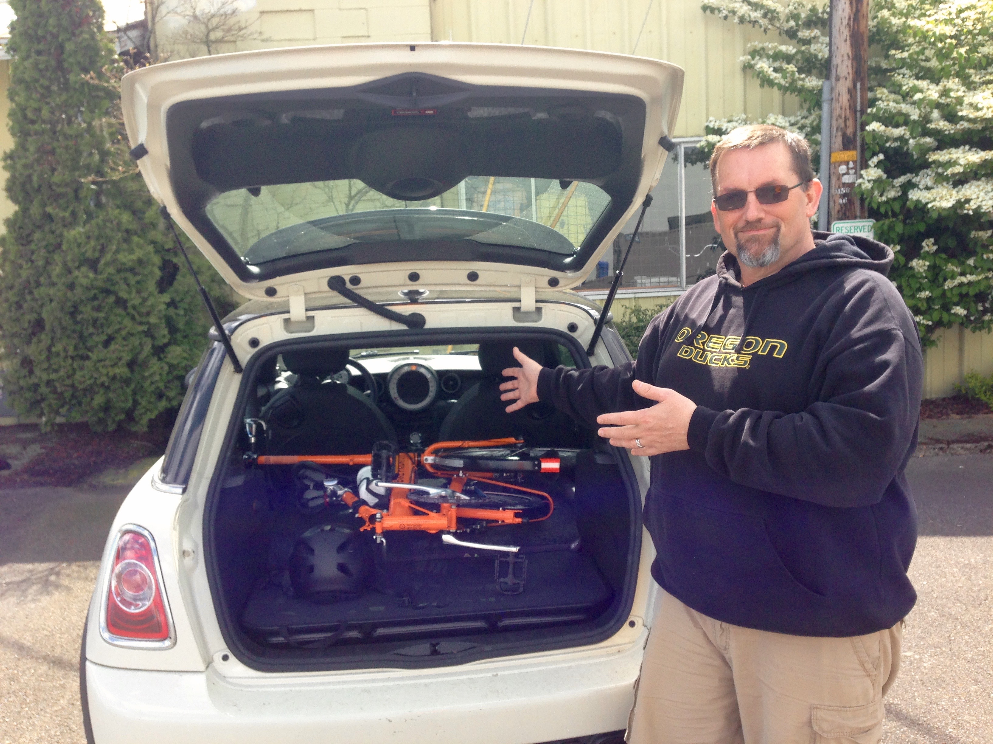 In order to get Silkie back home to Salem from Eugene, the bike had to fit into my 2011 Mini Cooper. Jeff had reassured me that he's put the folded bicycle into Minis before. I also measured the small back compartment and confirmed Silkie should fit.