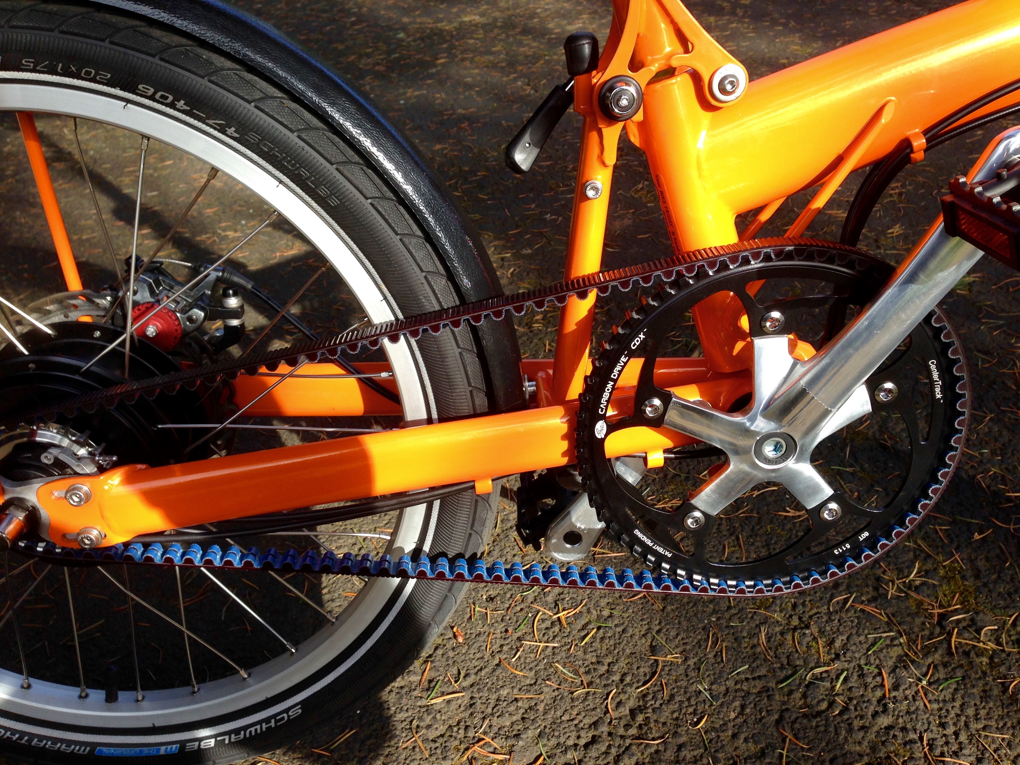 I ordered the Silk with a carbon drive belt, instead of a chain, because I really liked this way of powering the rear wheel. Like I said before, "Goodbye to a clunky chain, and the need to lubricate, clean, and adjust one."