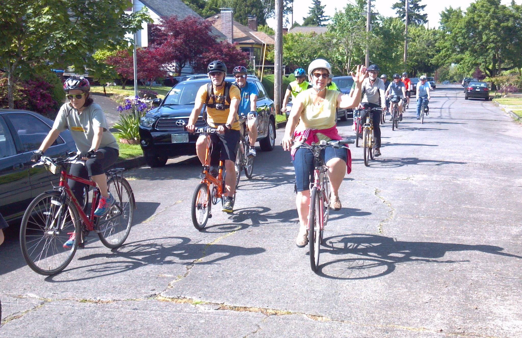 Here's a photo from a Salem Bike Boulevards Advocates post about the tour. Diana Dickey is on the front right. I'm riding the small-wheeled bike in the middle, my Go Pro camera wrapped around my chest.
