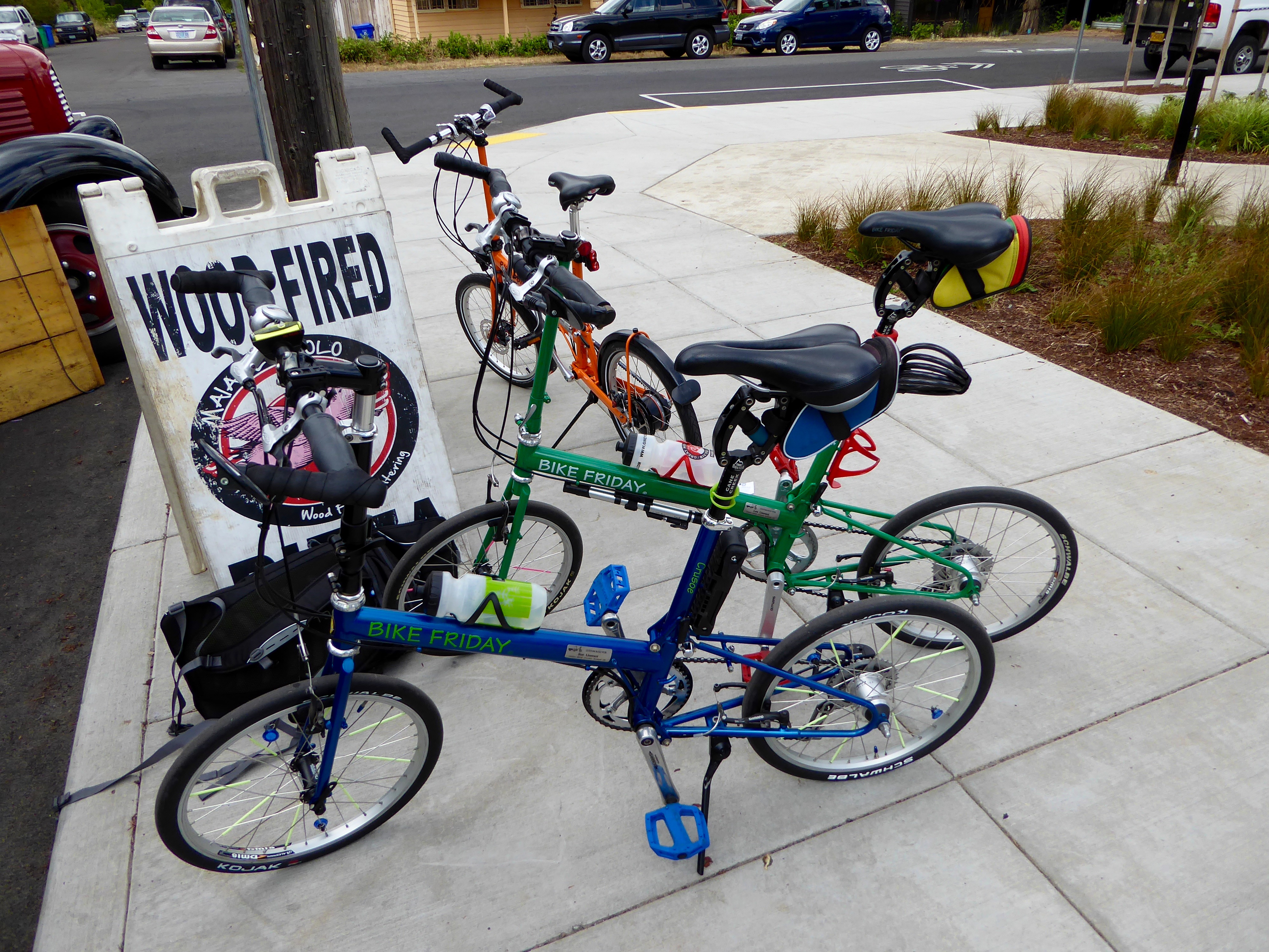 After parking my orange Bike Friday folding Silk to get the pizza slice, I turned around to find two blue and green Bike Friday bikes had joined mine. That led to a conversation with a Vancouver, Washington couple who regularly come to the Portland Sunday Parkways events.