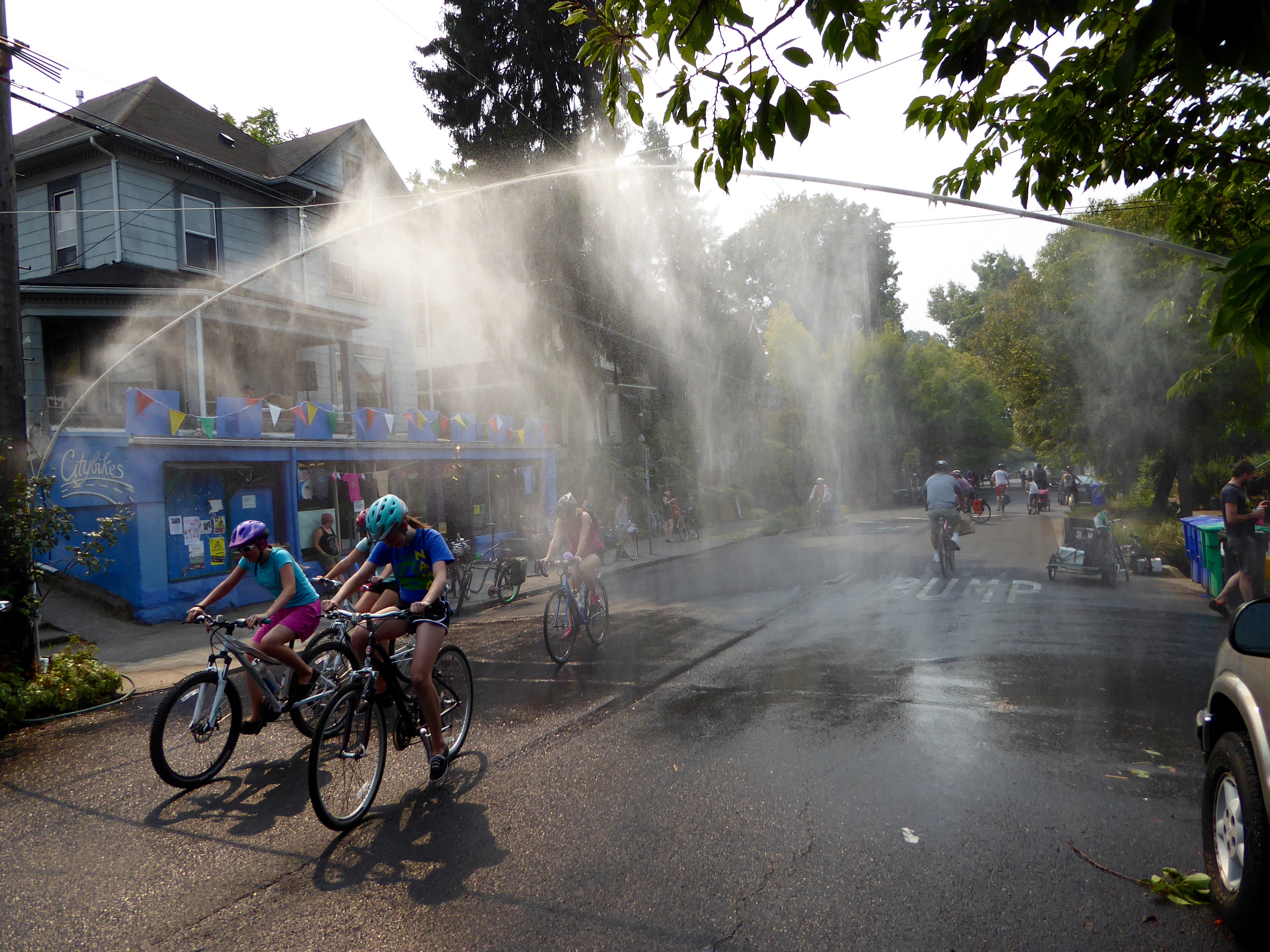 CItyBikes, a worker-owned cooperative bike store, lay along the route. They'd set up a water mister. It felt good on a hot day.