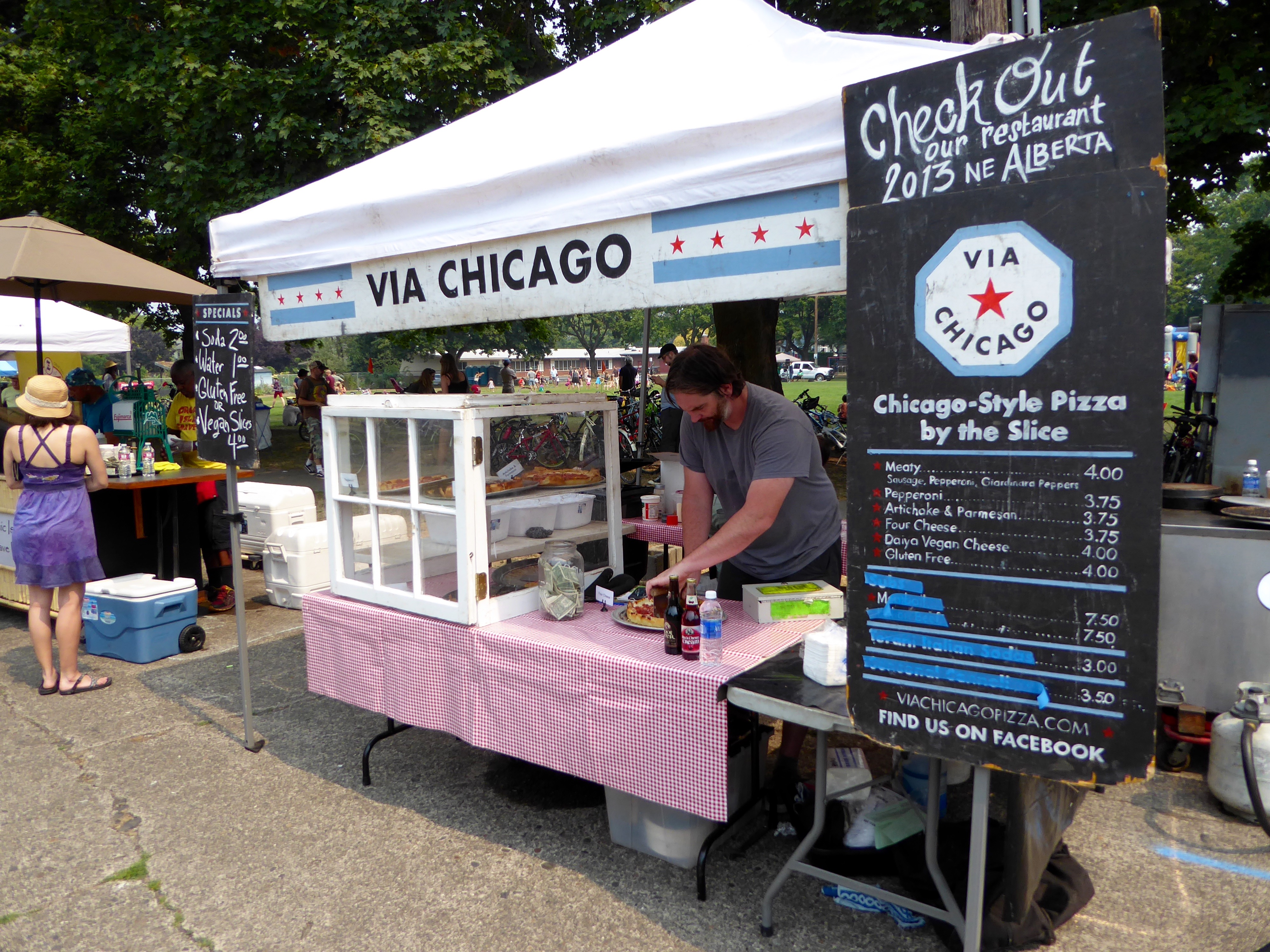 After driving up from Salem, my Bike Friday folding bike ("Silkie," because it is the Silk model) tucked in the rear compartment of my Mini Cooper, my first stop was to fuel up at a pizza stand. Very Portland. Had to eat the slice with a fork, it was so thick and cheesy.