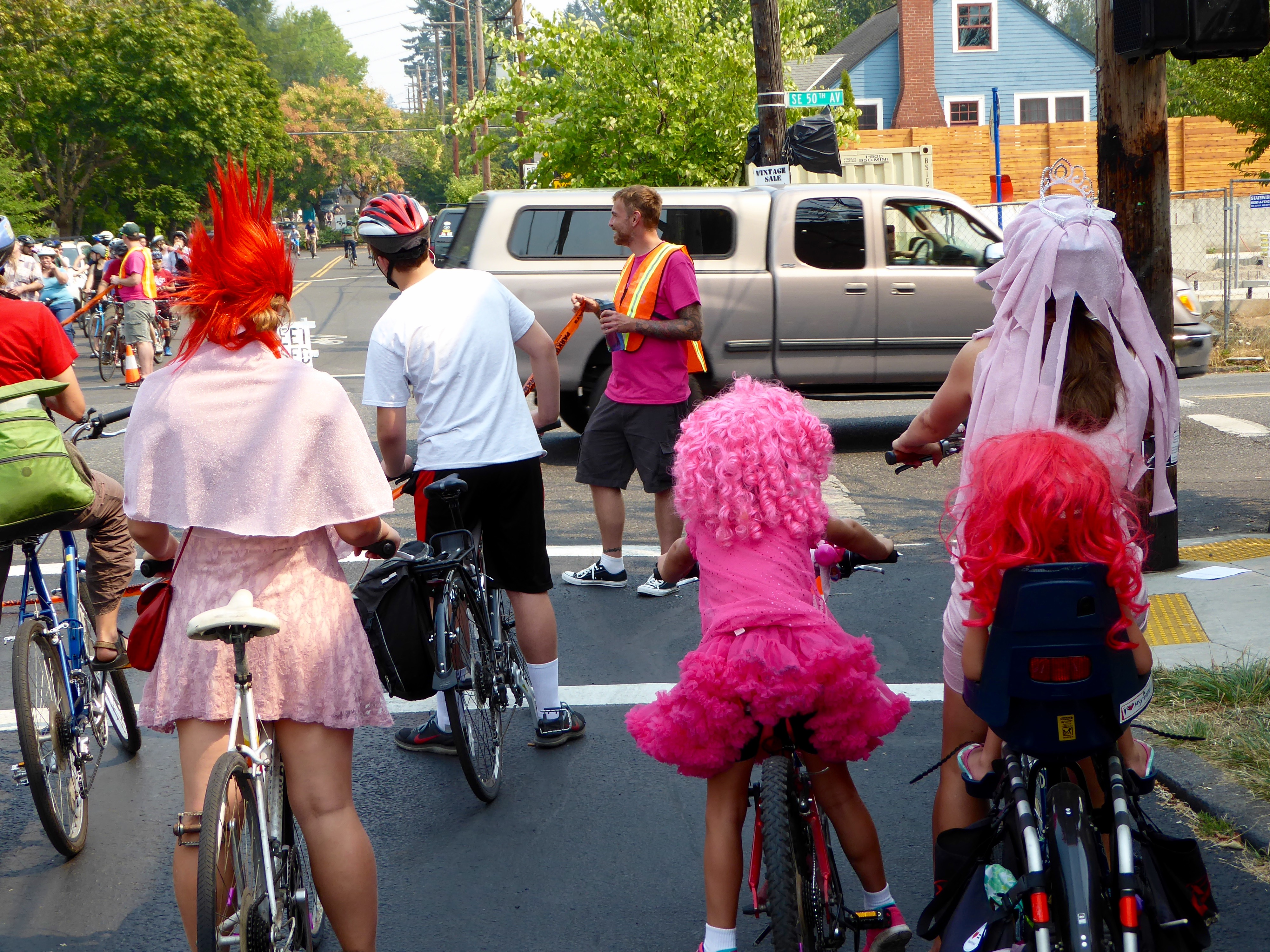 Quite a few cyclists dress up in various guises. The girl in pink loved honking her horn. If I'd had to listen to it for longer than a mile or so, the incessant sound might have gotten annoying. But it was cute… in moderation.