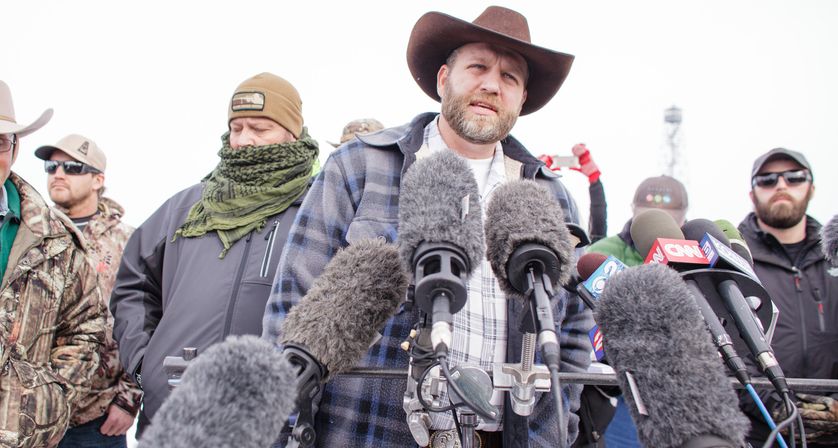 Accept whatever charges law enforcement throw at you for your illegal acts. Be happy that your crazy ideas have been publicized way beyond what they deserve. Go home and try to change this country for the better through the rule of law and political action, not via unreasonable armed threats.