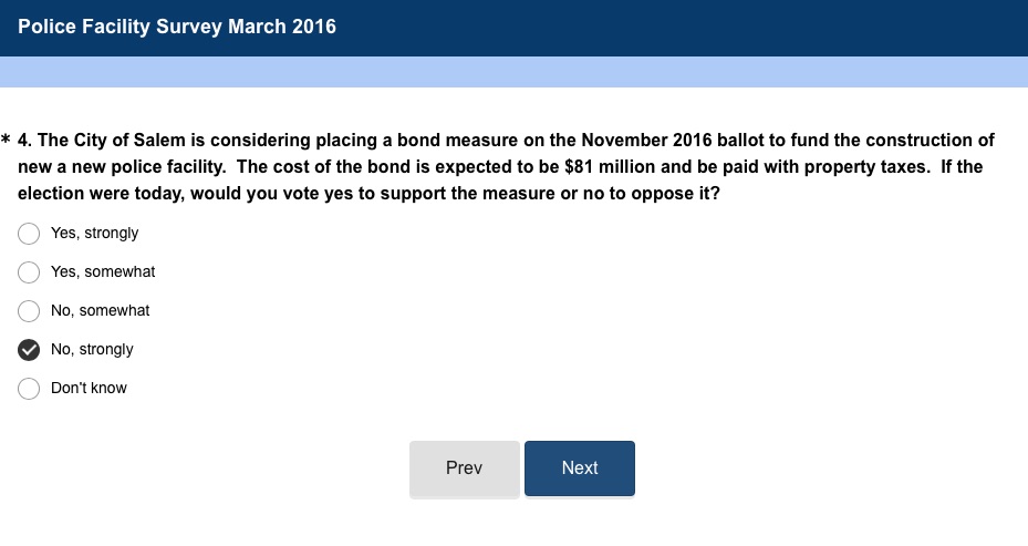 The City of Salem has put up a Survey Monkey poll about the proposed $80 million, 150,000 square foot police facility — which is vastly overpriced, threatens the vitalization of downtown, and has sucked up money needed to make the Library and City Hall earthquake-ready.