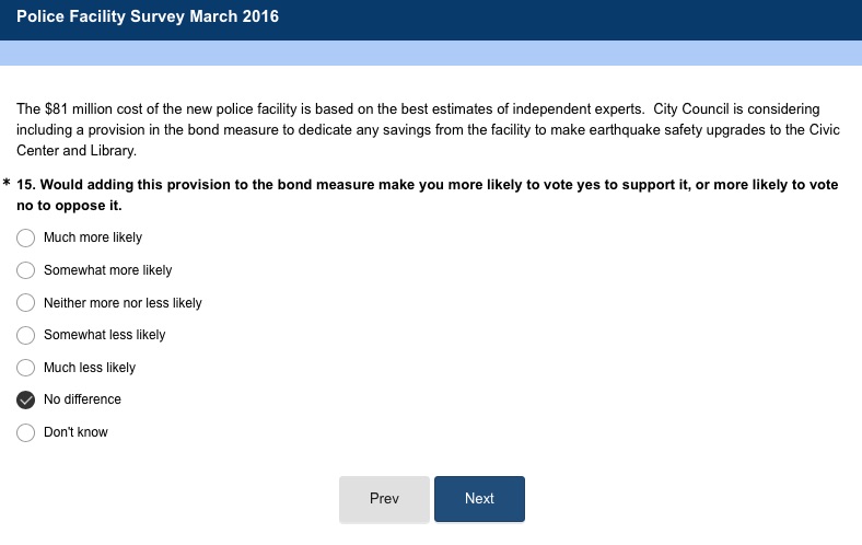 Question 15 asks if you'd be more or less likely to vote for the bond measure if you knew that purported savings from the $81 million construction cost would go for earthquake safety upgrades to the Civic Center and Library. Either say LESS LIKELY or NO DIFFERENCE.