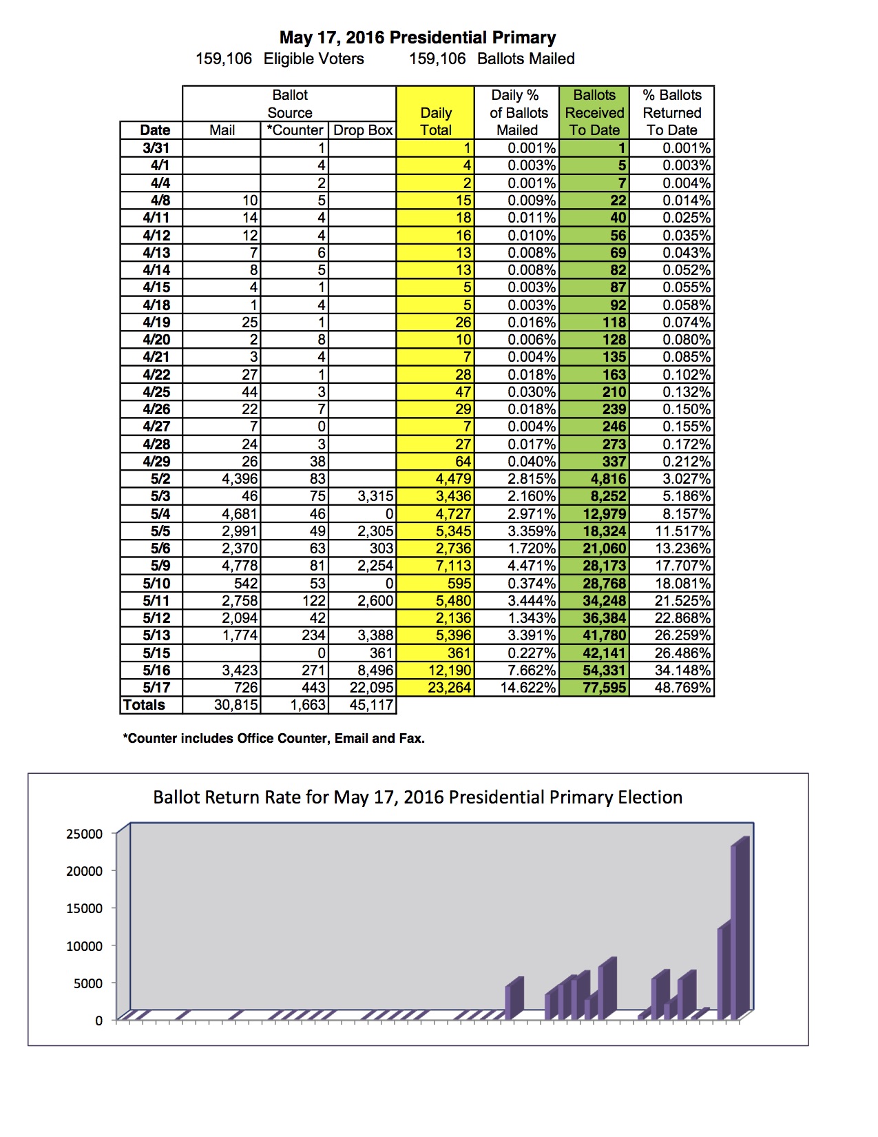 Thirty-four percent came in gradually during the two weeks prior to election day; fifteen percent came in on May 17, election day. Most of the day-of-election ballots were dropped off, since there's plenty of warnings not to mail your ballot even a week before election day, because of the risk of the USPS not delivering it in time.