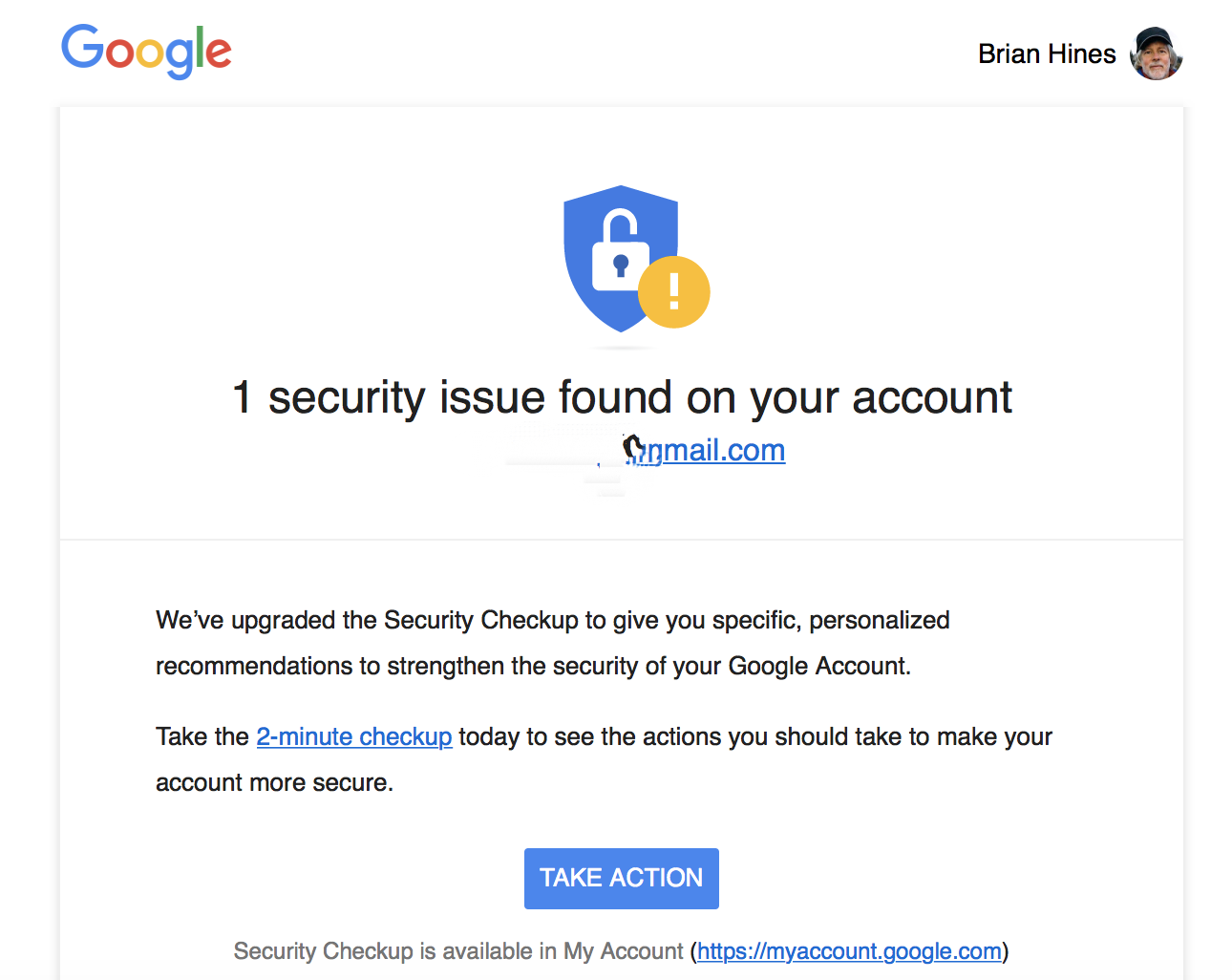 At first I thought this could be a scam. But after Googling "Google security issue found on your account" I became convinced that the email message really had come from Google.