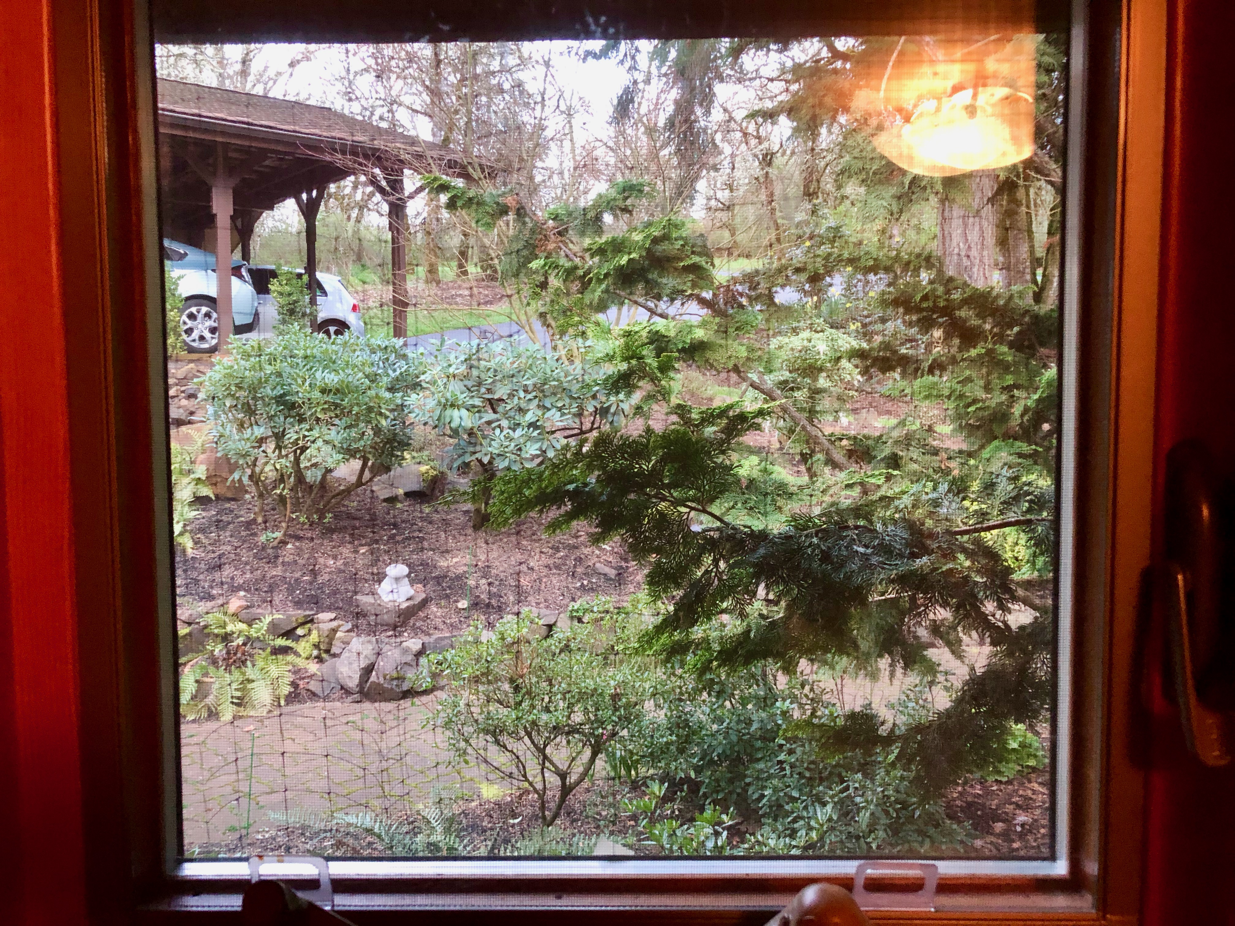 Then, in 2011, I wrote "How we stopped a robin's pecking on window glass." The solution, which you're aware of, because I've used it on you in 2019, as shown below, was netting that I attached over several bedroom windows.