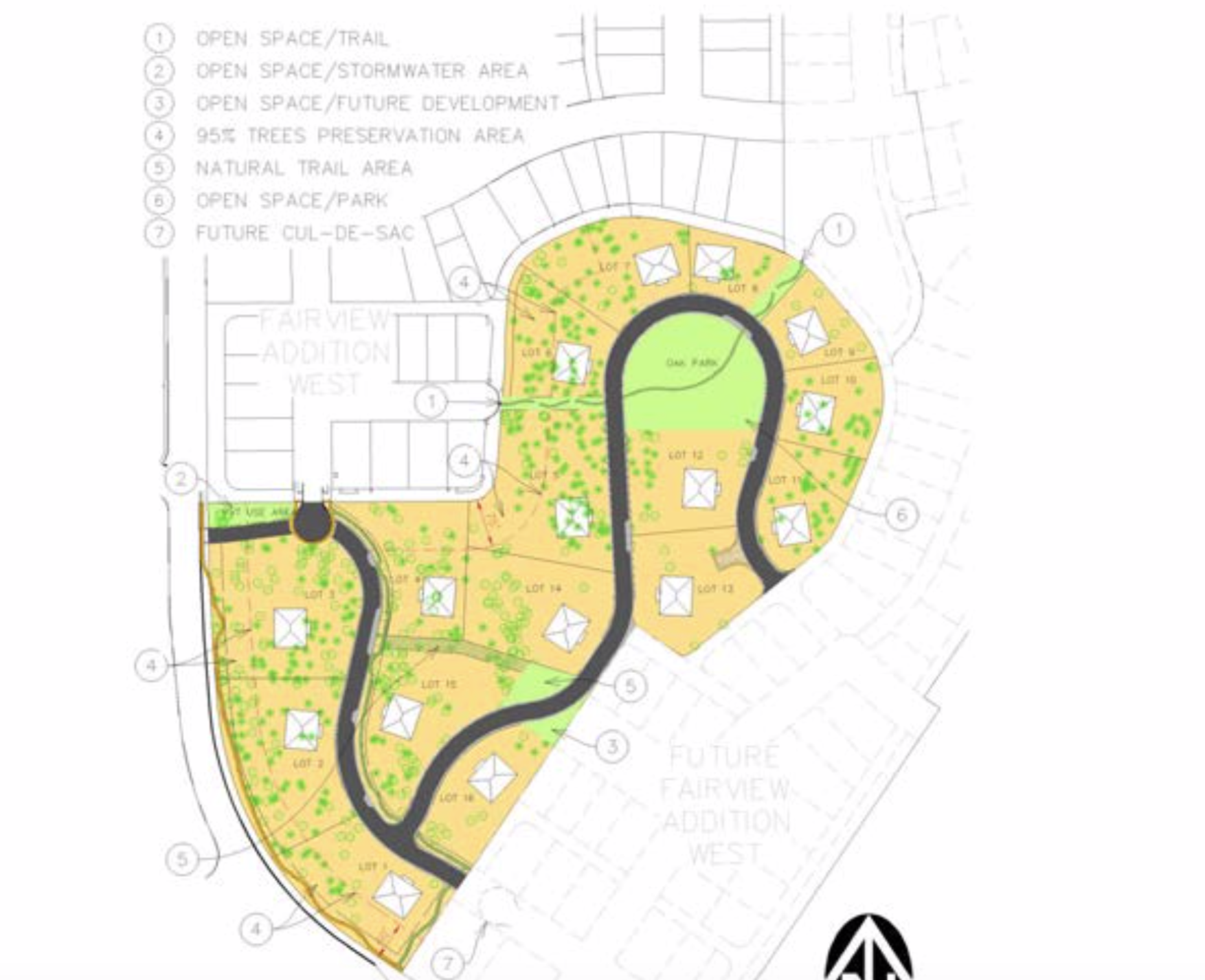 So what he came up with was a way to save most of the trees and allow public access to the property by having only 16 lots on the 14 acres — with the lot sizes ranging from .3 acre to 1.1 acre. Here's a map from the Fairview Woods Refinement Plan.