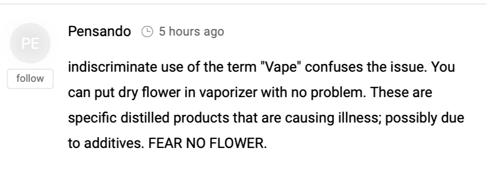 The media and the CDC are doing their best to make marijuana the “evil weed” again. I am a 68 year old Med Marijuana patient from Michigan with chronic degenerative disc disease. I have been vaping flower with my PAX 3 for over 4 years for pain and depression. Without it, I don’t know what I would do. The media and the CDC have never made a statement about vaping flower.