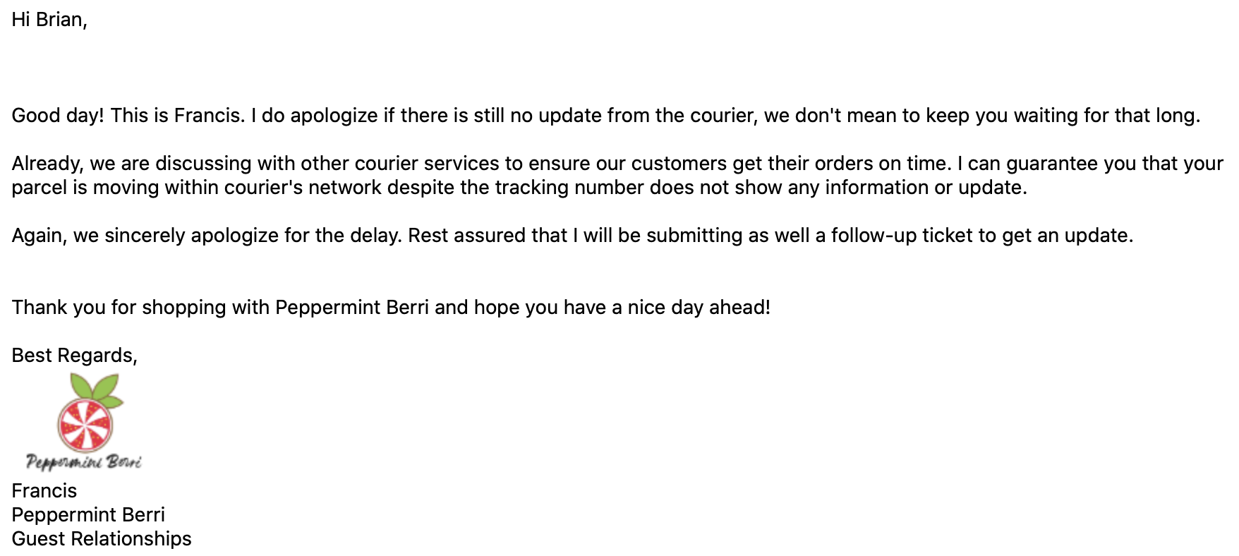 Here's the other 34 reviews from unhappy Peppermint Berri customers. After the reviews I'll share a screenshot of the annoying repetitive email I've been getting from "Francis" at Peppermint Berri, along with a screenshot of the non-existent tracking information.