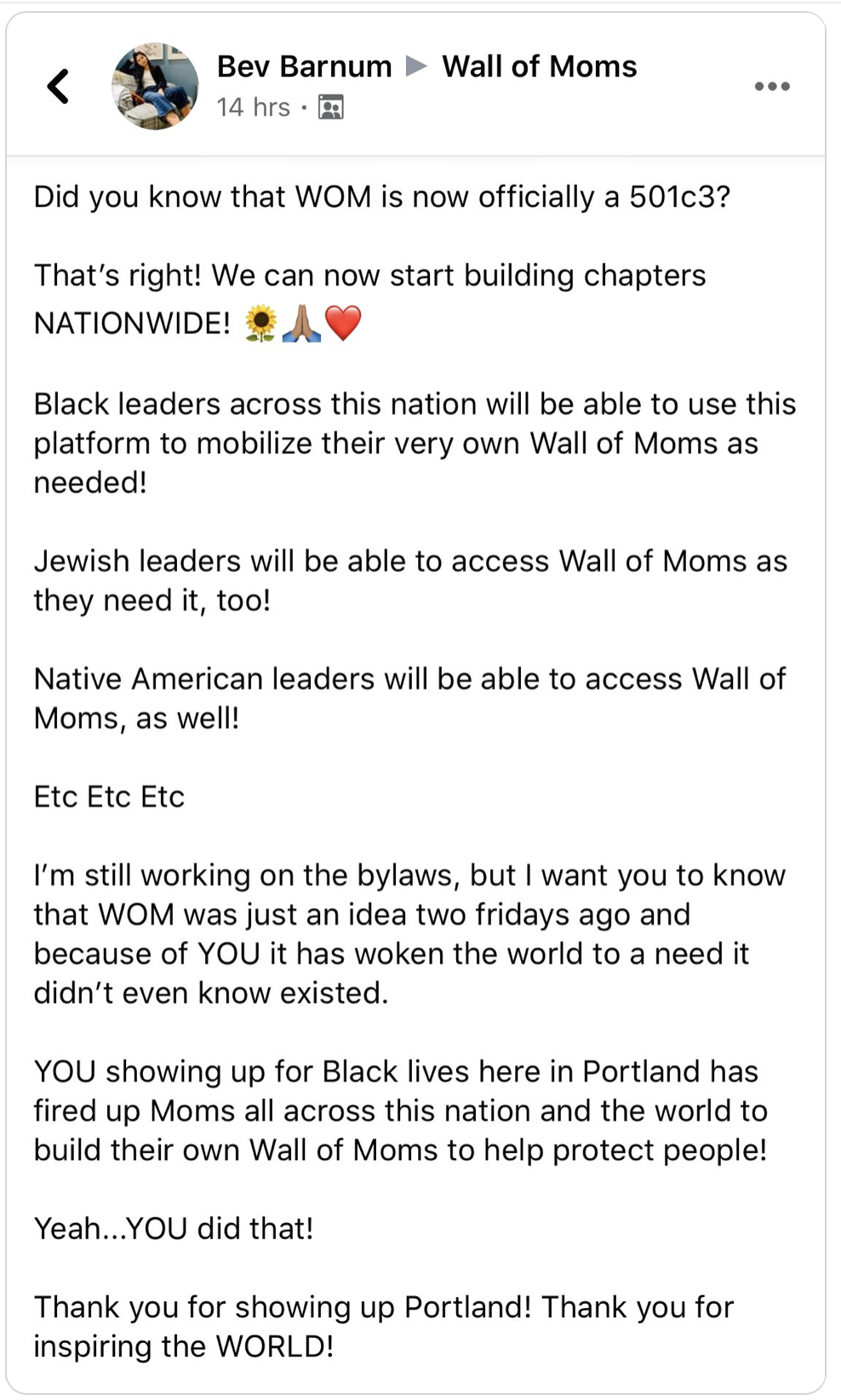 This is big bowl of bullshit. Bev Barnum burned that group down for her own benefit. I watched it all happen in real time as she apologized profusely to Black leadership she proclaimed to have turned the group over to, only to then quickly derail their leadership by deleting them from the group as admin and posting her 501c3 rhetoric.