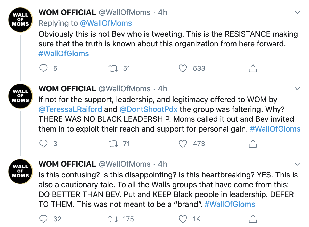 The Wednesday post alleges that Wall of Moms founder Bev Barnum filed for business registrations without consulting the newly instated Black leaders and that the safety of Black members at the nightly protests in downtown Portland was overlooked.