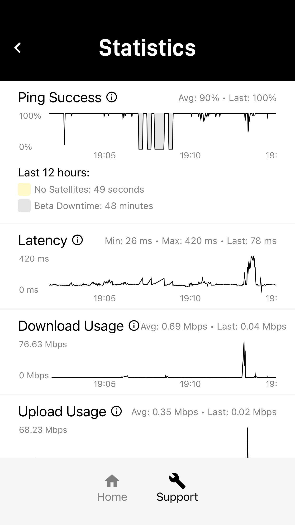 In the 27 or so hours the Starlink has been on our roof, download speeds have varied a lot — from an unusual low of 6 Mbps, to the more typical 40-90 Mbps, all the way to an occasional 140 Mbps.