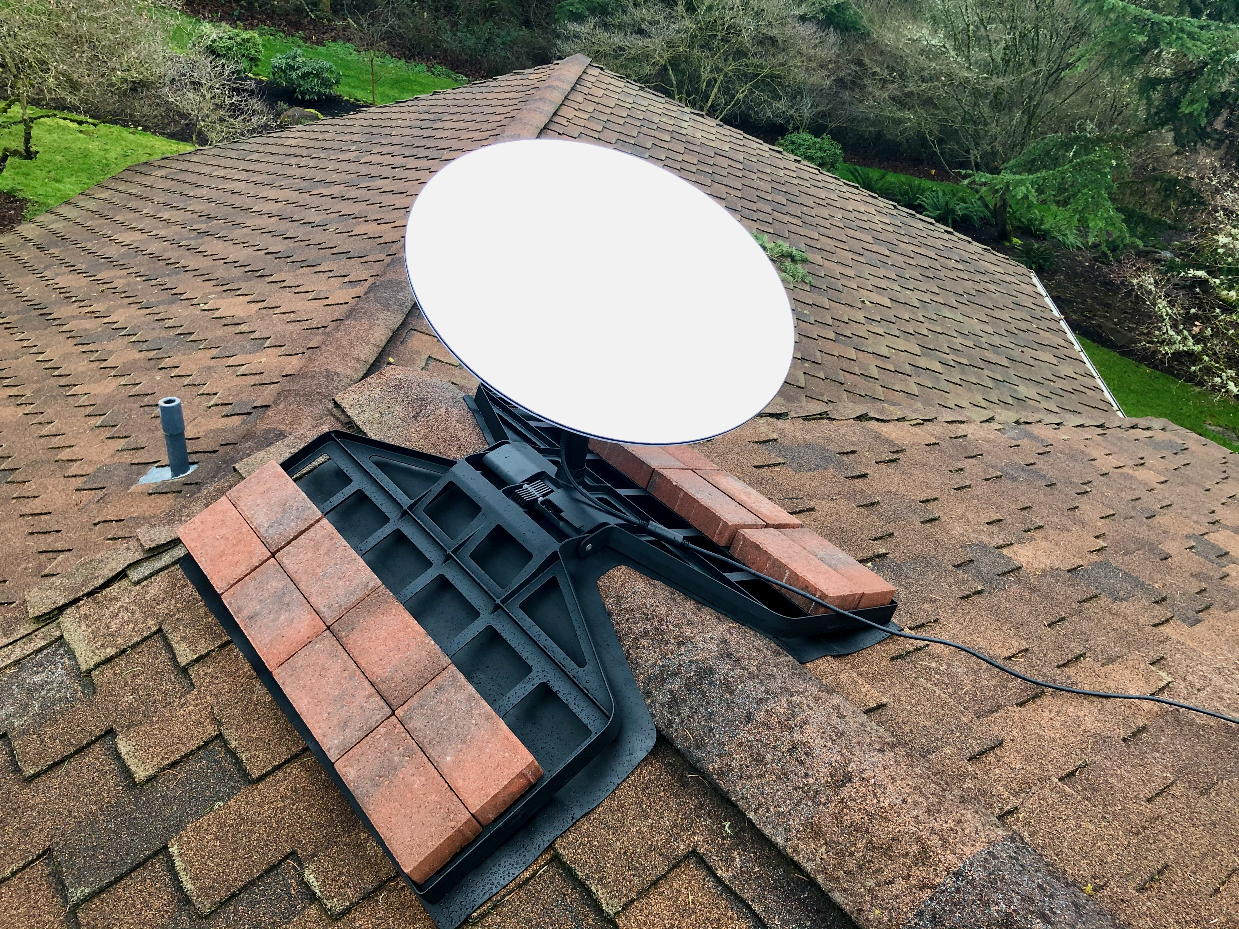 Installing the Starlink on our roof was easy. I'd already gone to Lowe's and purchased 16 5-pound red bricks, which were needed to weight the Ridgeline Roof Mount with the required 80 pounds of stability.