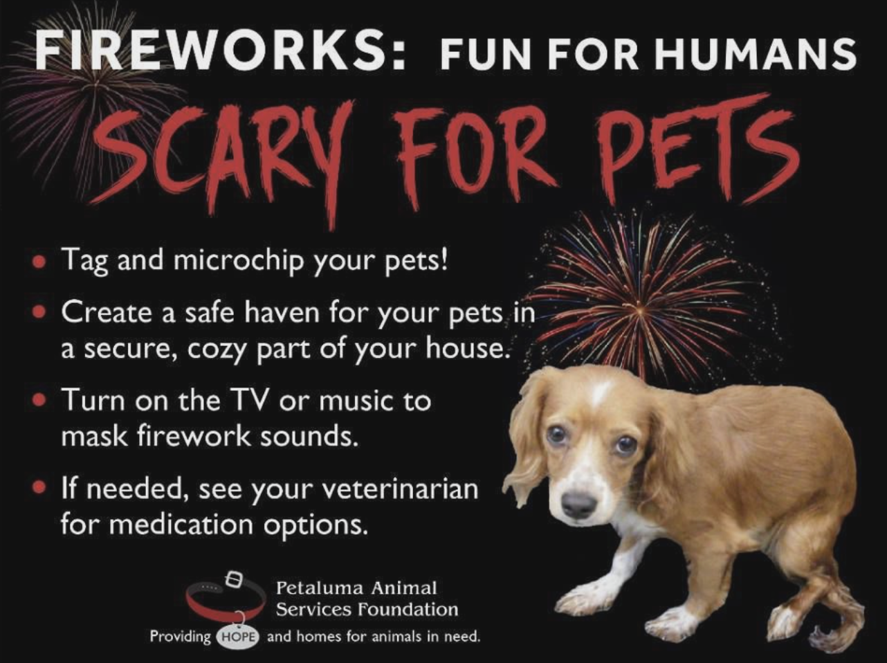 On the Fourth of July, many pets become so frightened by the noise and commotion of fireworks that they run from otherwise familiar environments and people, and sadly become lost.