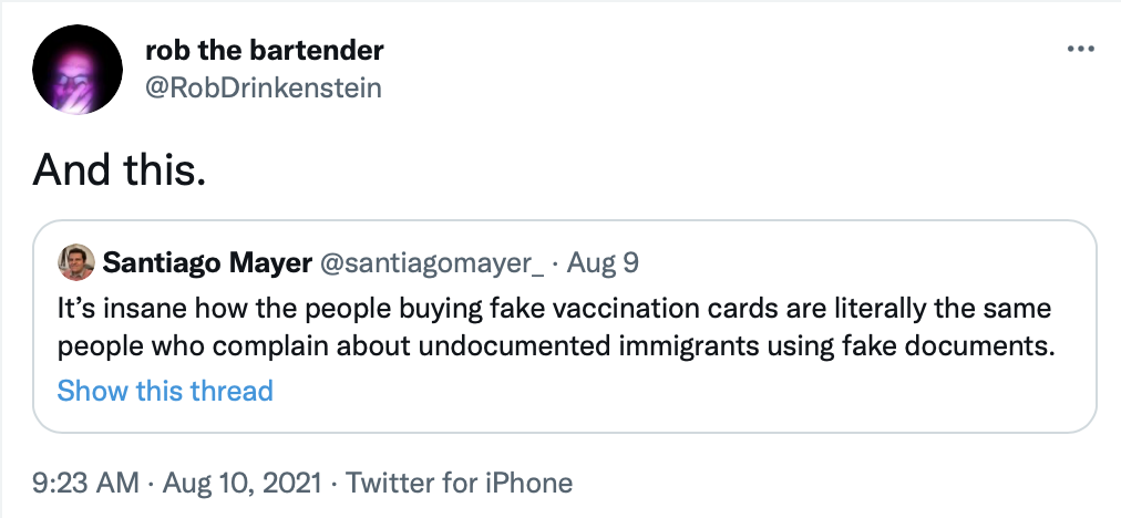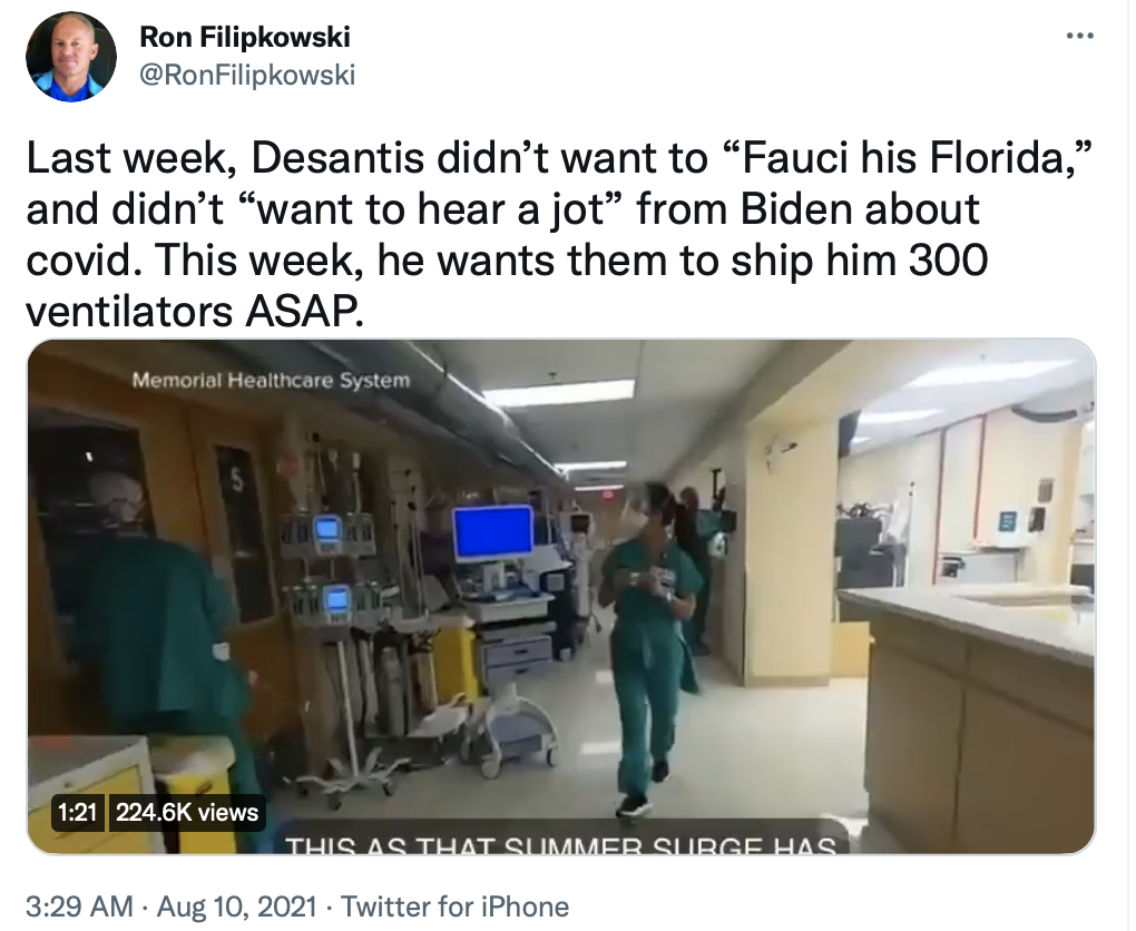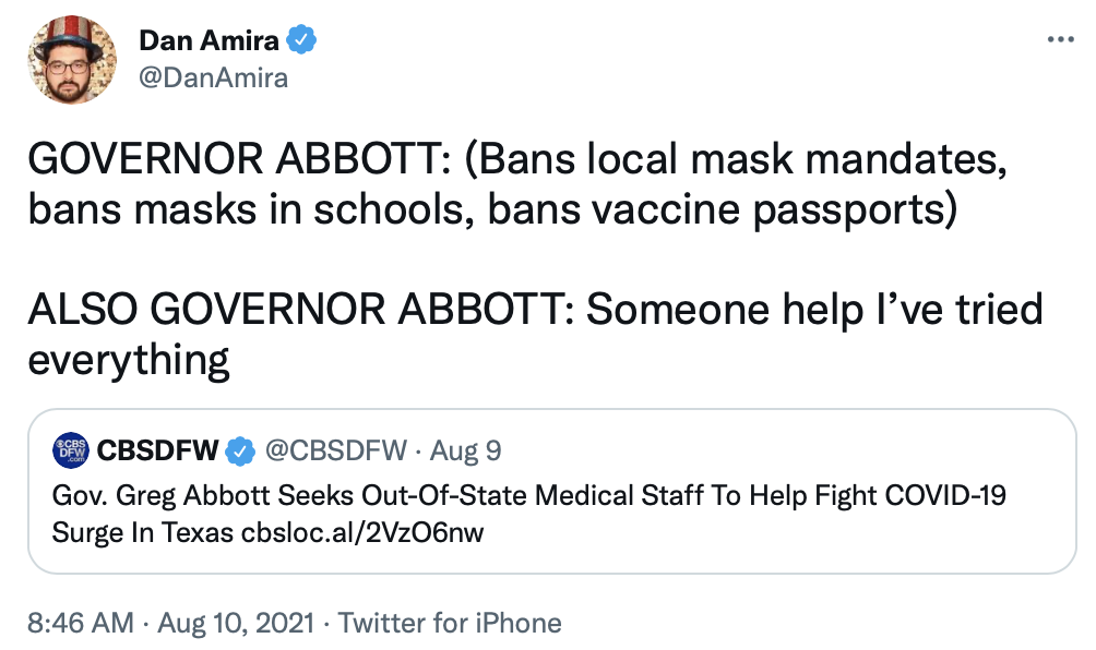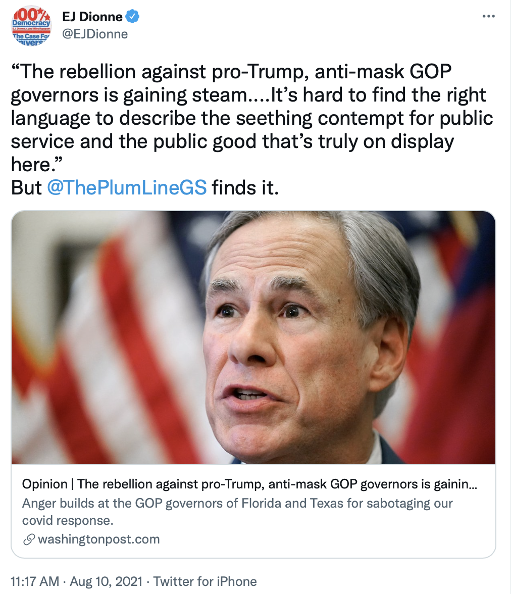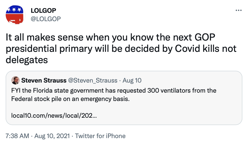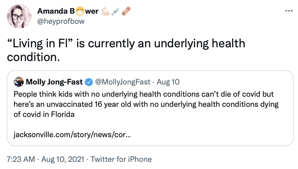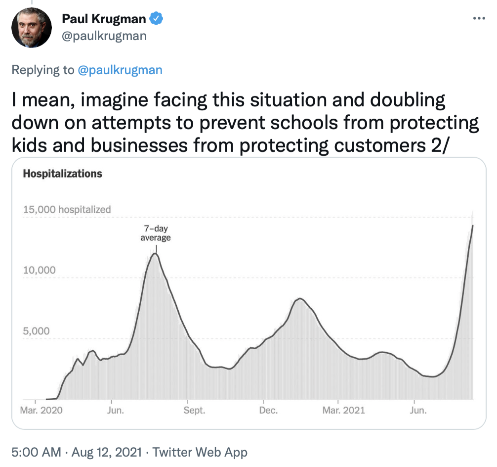 For the past few days I've been collecting tweets from my Twitter feed related to the current Covid state of affairs. Most have to do with the horror show of Republican governors in Florida and Texas doing their best to kill people in their states by trying to prevent mask mandates, including in schools — where children younger than 12 can't get a vaccine yet.