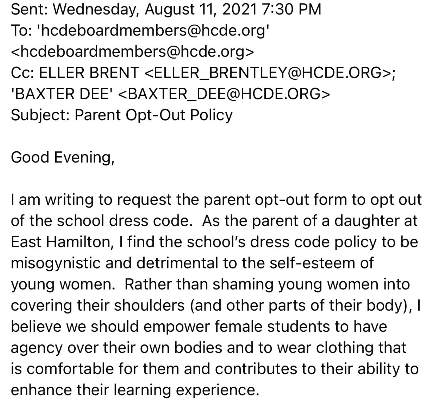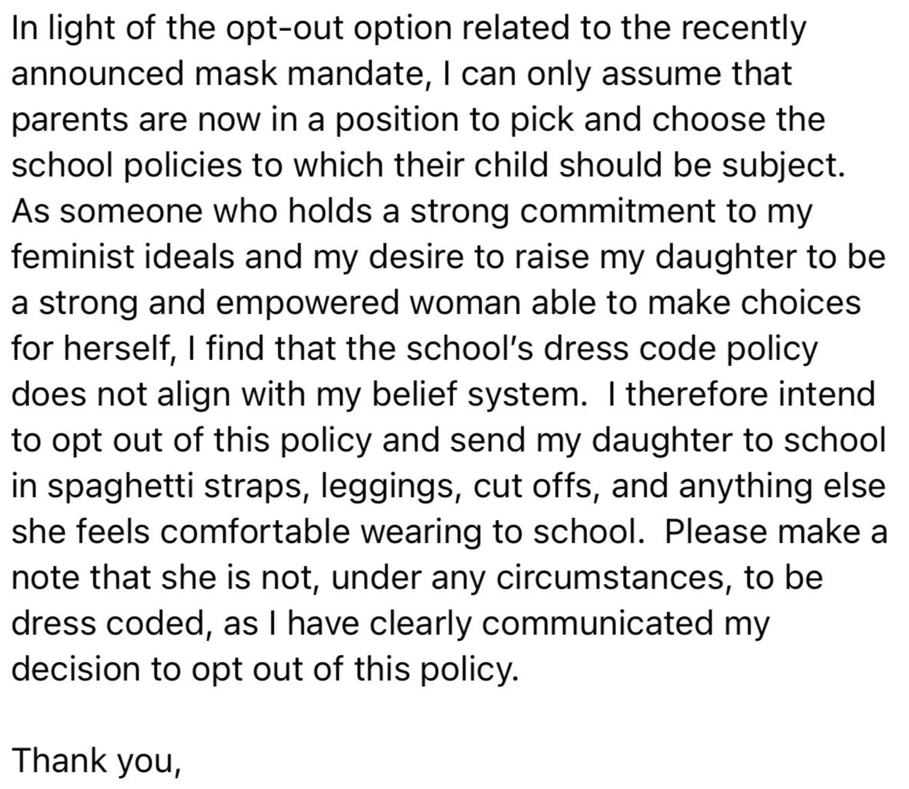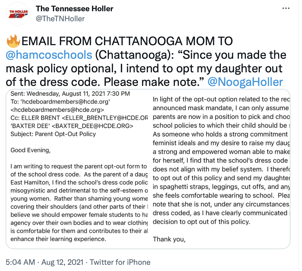 And one humorous tweet, my favorite, is from a woman in Tennesee who sent a marvelous email to school authorities regarding their policy of allowing parents to opt out of their children wearing a mask. She says that this must mean an opt-out of the school dress code is possible. So her daughter will be wearing provocative clothing now, if she wants.