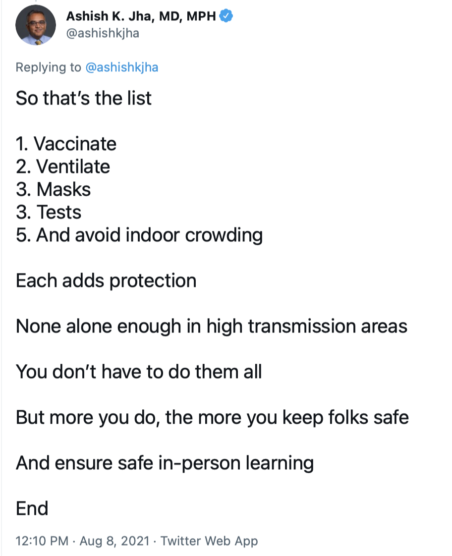 And the facts are that the Delta variant now accounts for almost all Covid cases in the United States; it is much more transmissible than original Covid; 19% of current Covid cases are occurring in children; hospitalizations among children are rising sharply; the Delta variant appears to cause more serious disease among the unvaccinated than original Covid.