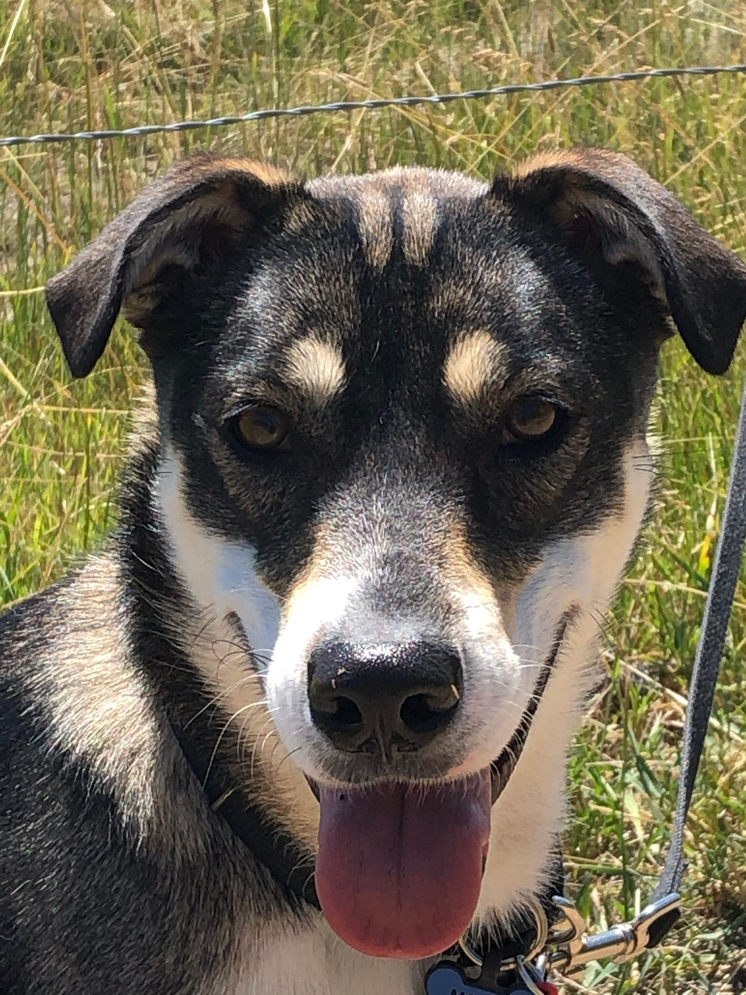 Following the purebred German Shepherd, we've had two Shepherd mixes and, most recently, a Husky mix. Here's a photo of Mooka, taken shortly after we adopted her from a Texas shelter in 2019.