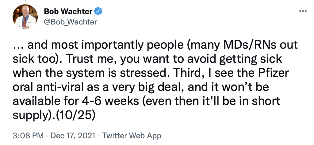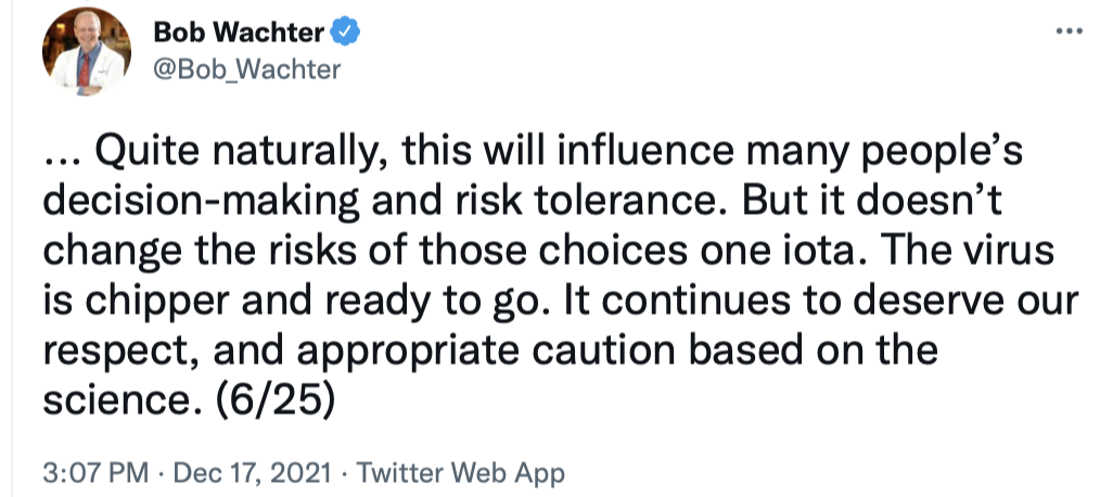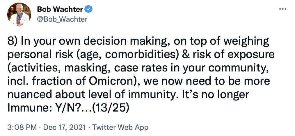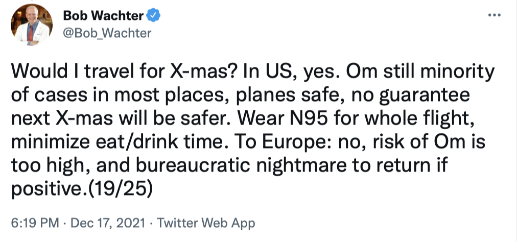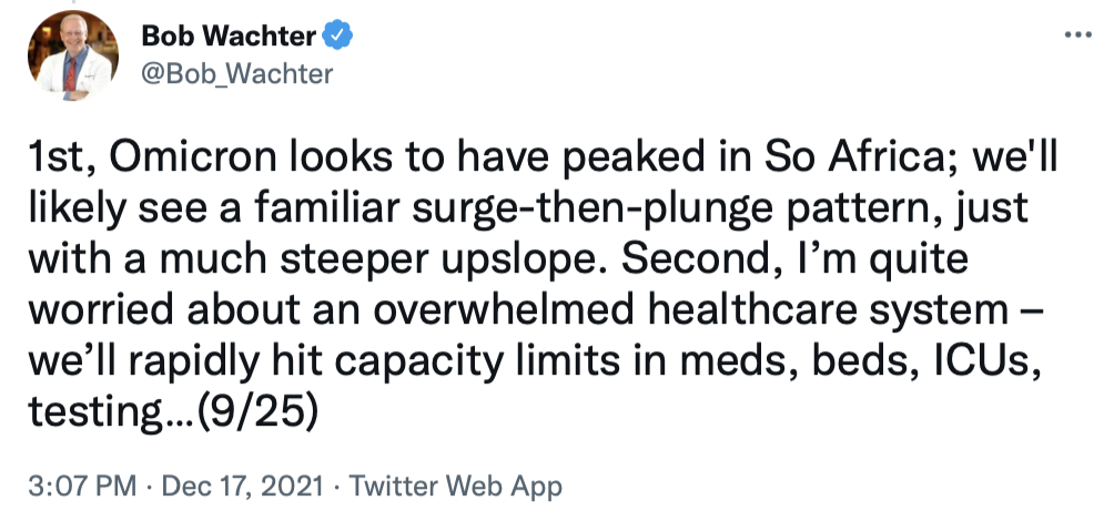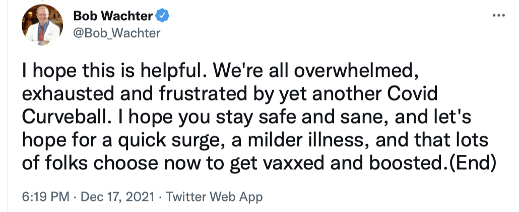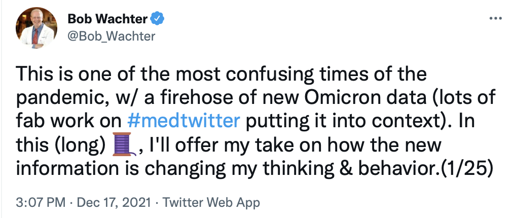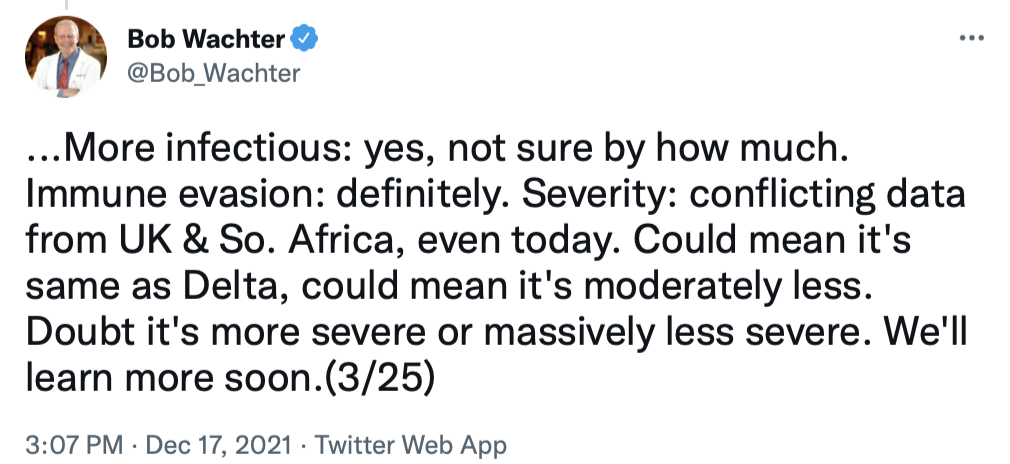 Here's a series of tweets by physician Bob Wachter today that do a good job of explaining what's currently known about Omicron and how we should react to it.