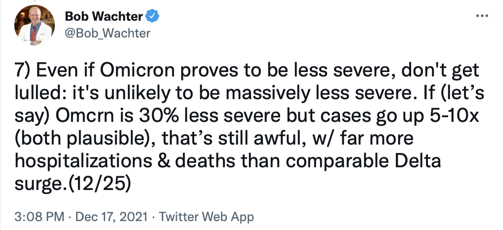Omicron spreads much more rapidly than original Covid and the Delta variant. So even if cases are milder on the whole, with so many people slated to come down with Omicron, serious cases are going to rise markedly.