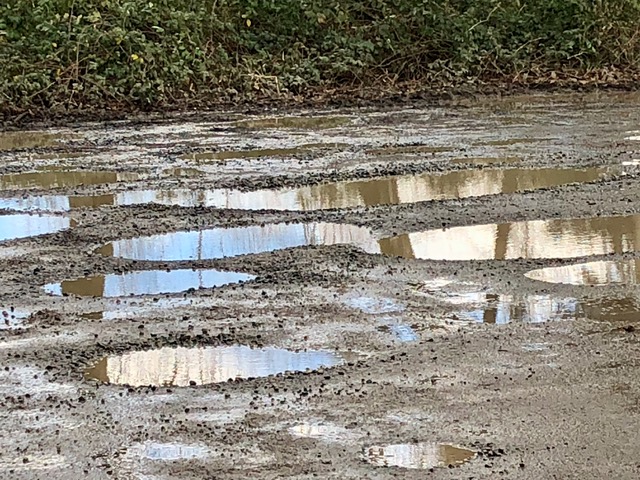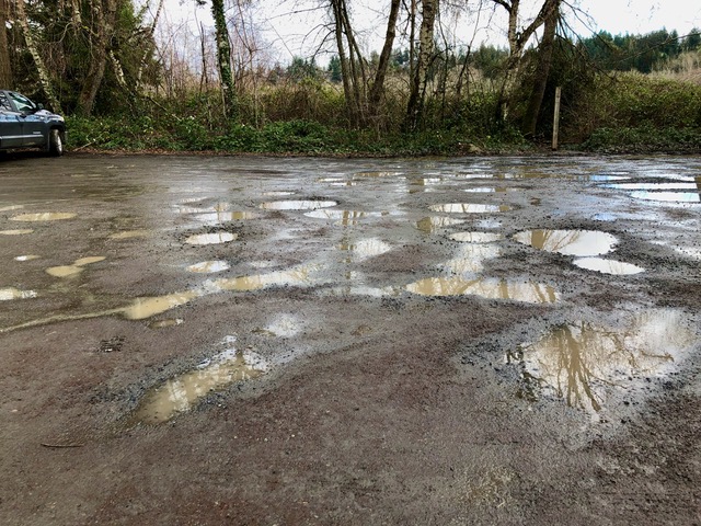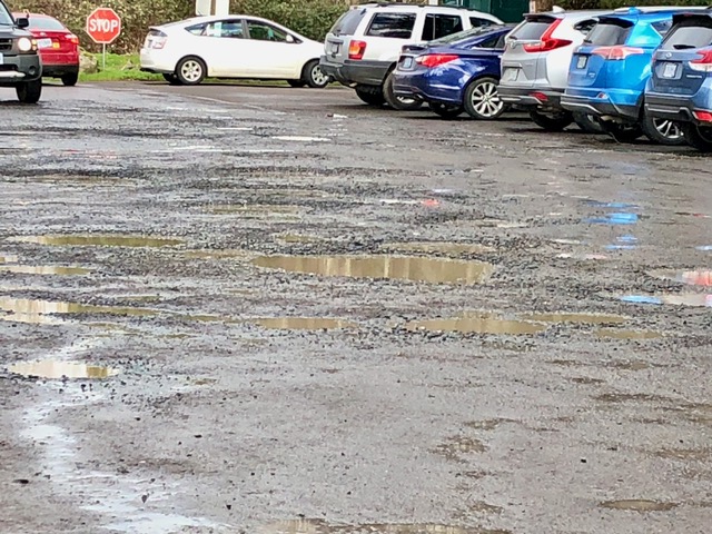 Stepped out of my car and into a mud hole 8n parking lot that covered my entire shoe up to my ankle. Quit wasting money filling holes w/ gravel everyyear. Just pave it!!!!