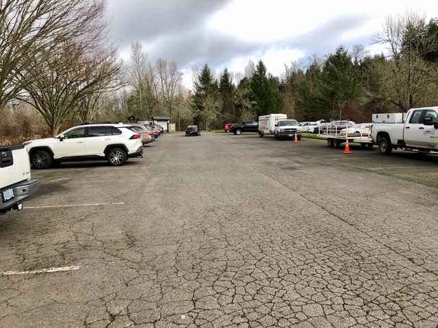 The parking lot has been full on recent weekend days in January that I have been there, (and quite full even on weekdays when not raining). It is severely rutted, puddled, and dirty. Dog owners have nowhere to clean off their dogs (or shoes) before putting them back in their cars. Entrances from the field back into the lot are wet, sticky mud.