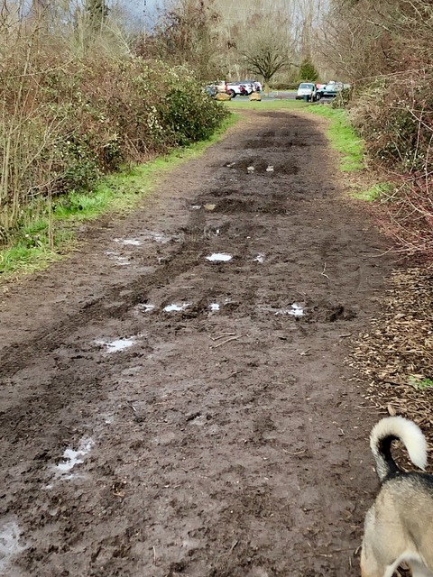 Below are photos from a January 20, 2022 day at the Minto Dog Park. The first three are of the rutted, puddled dog park parking lot. The second is the muddy walking path. The last photo is of the paved lot just inside the Minto Park entrance about a mile from the dog park area, to show how different a paved lot was on the same day.