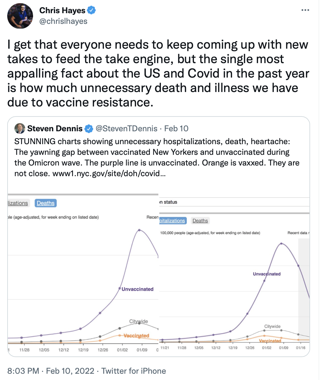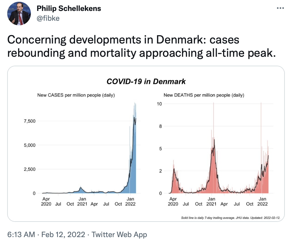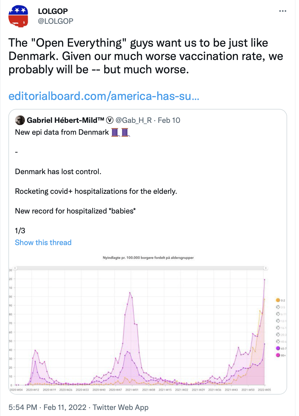 For about a week I've been collecting Twitter tweets from people knowledgeable about the current state of the Covid crisis. Most of them deal with the danger of relaxing public health measures too soon. Denmark did away with all restrictions, and now is paying the price in deaths and cases.