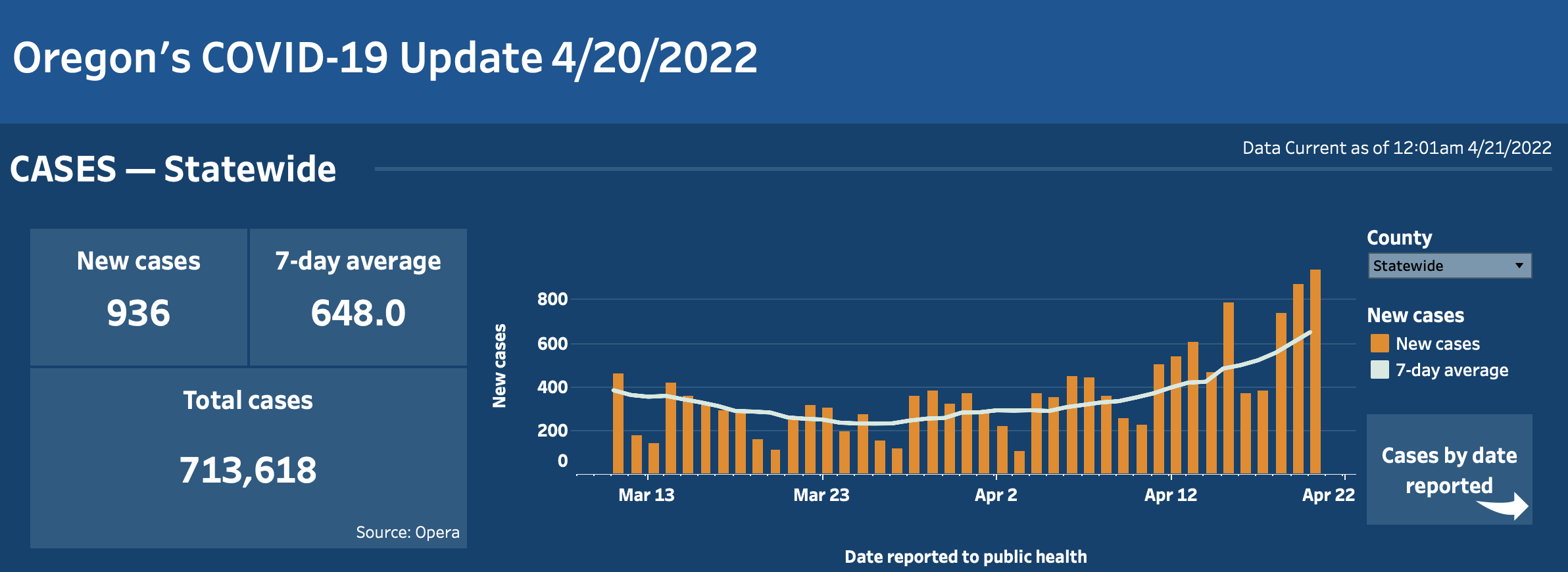 The real number of cases is at least ten times greater than shown, since most people with symptoms are getting tested for Covid at home now, so the vast majority of cases aren't getting reported to the Oregon Health Authority.