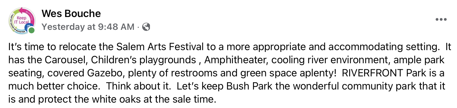 Having been unimpressed with the new Salem Art Fair location in Bush Park — as described in "Salem Art Fair better for trees in new location, but not as pleasant now" — when I saw Wes Bouche's Facebook post, I thought Great idea! ( I assume last two words were meant to be "same time.")