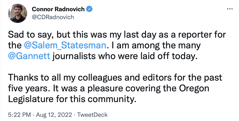 Since Salem is the Oregon capital, and Radnovich was the reporter for state government/legislature, naturally the non-geniuses at the Gannett Corporation picked him to be fired — a dumb move if the Statesman Journal wants to be a quality newspaper, which obviously isn't the goal here.