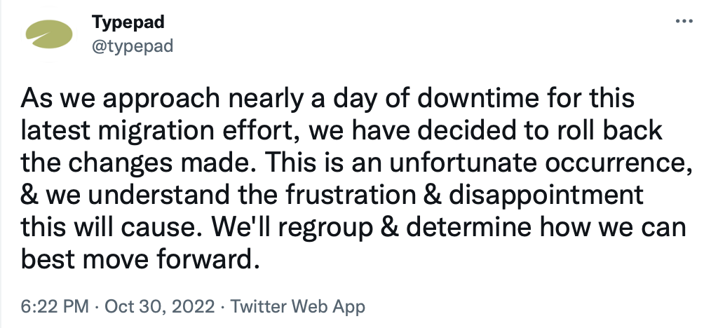Late on Sunday, Typepad tweeted that the migration had failed and it was being undone.