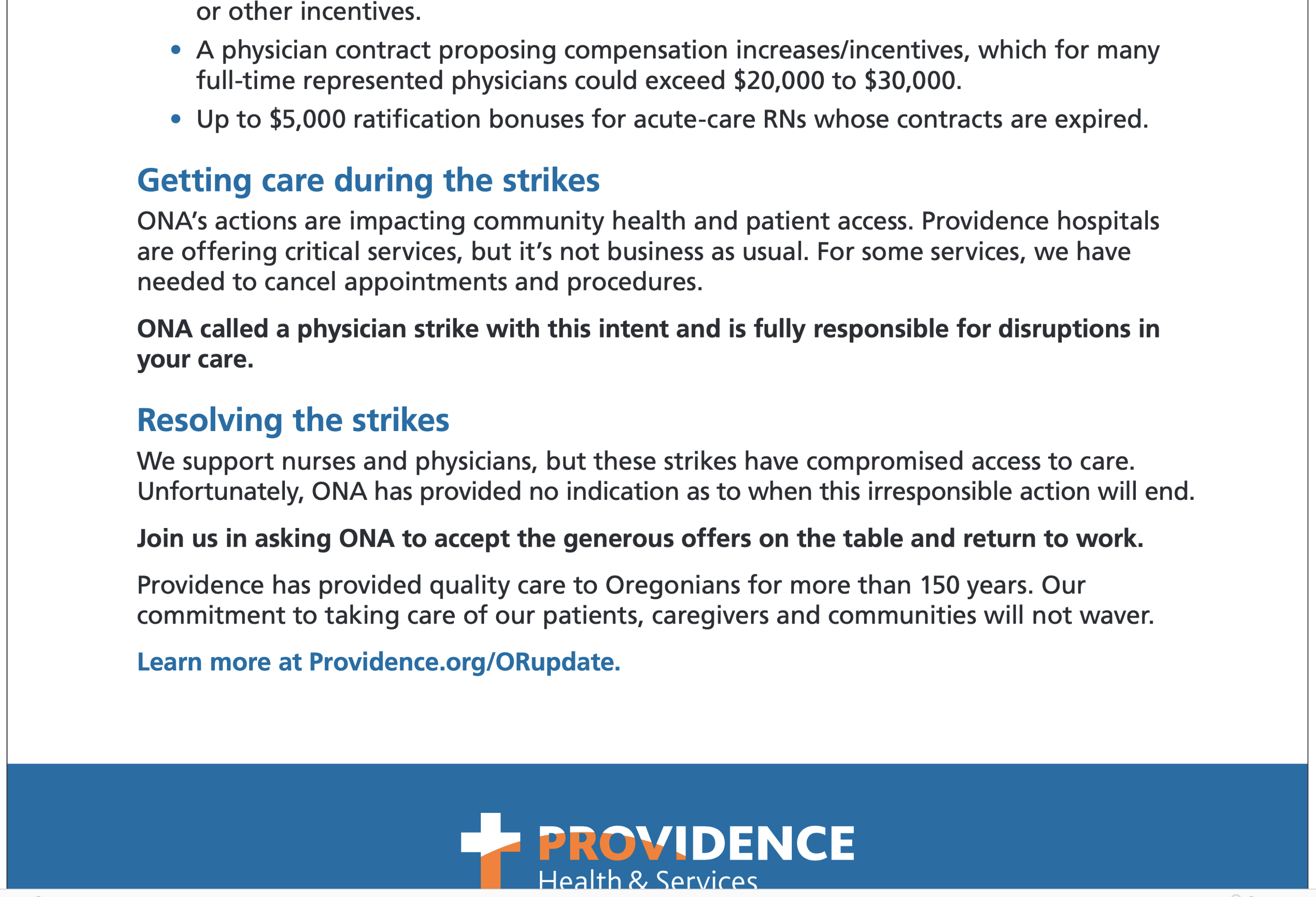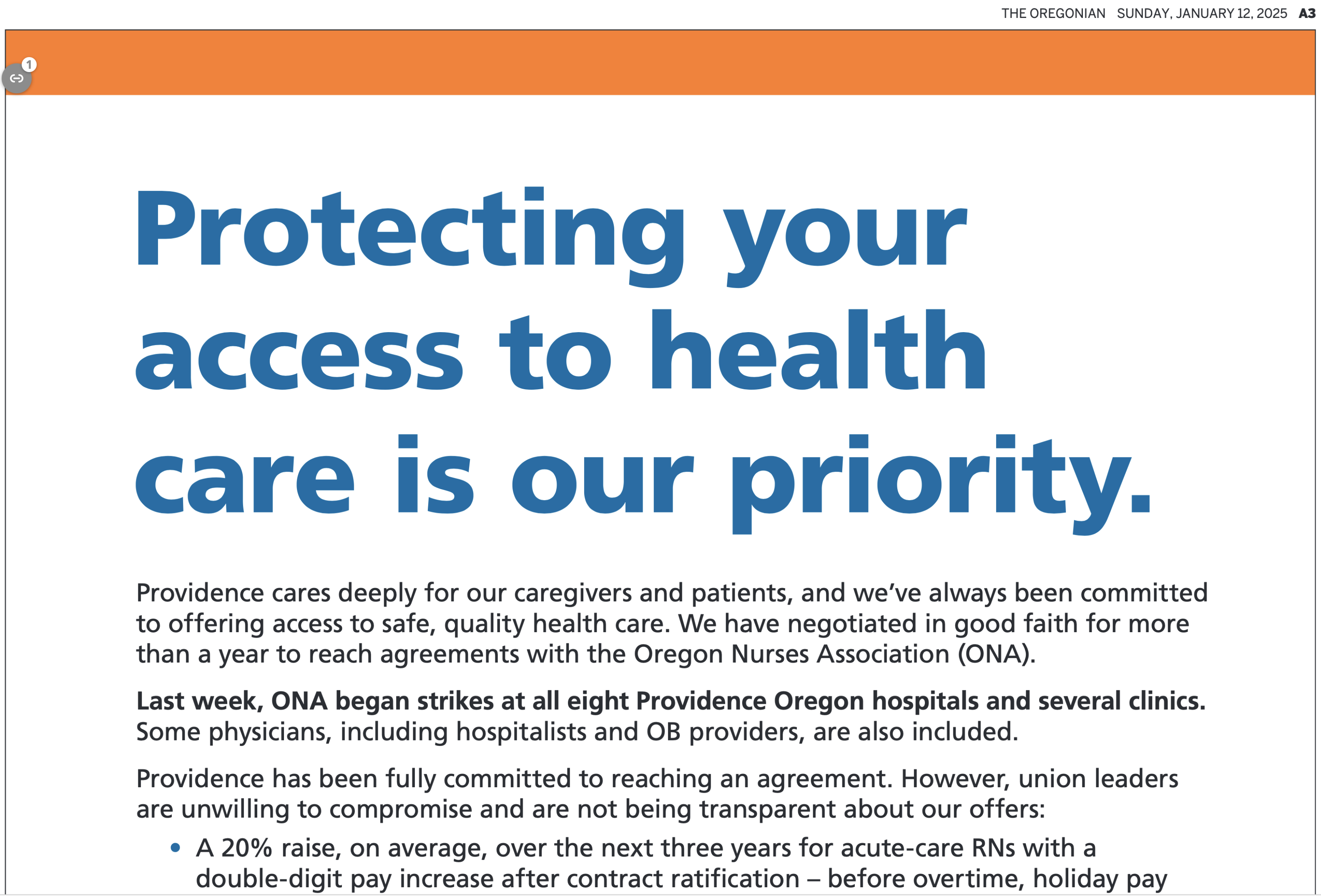 Today Providence paid for a full page ad in the Sunday Oregonian newspaper. I'm a digital subscriber. Here's screenshots of the ad, which I found annoying and demeaning toward nurses.