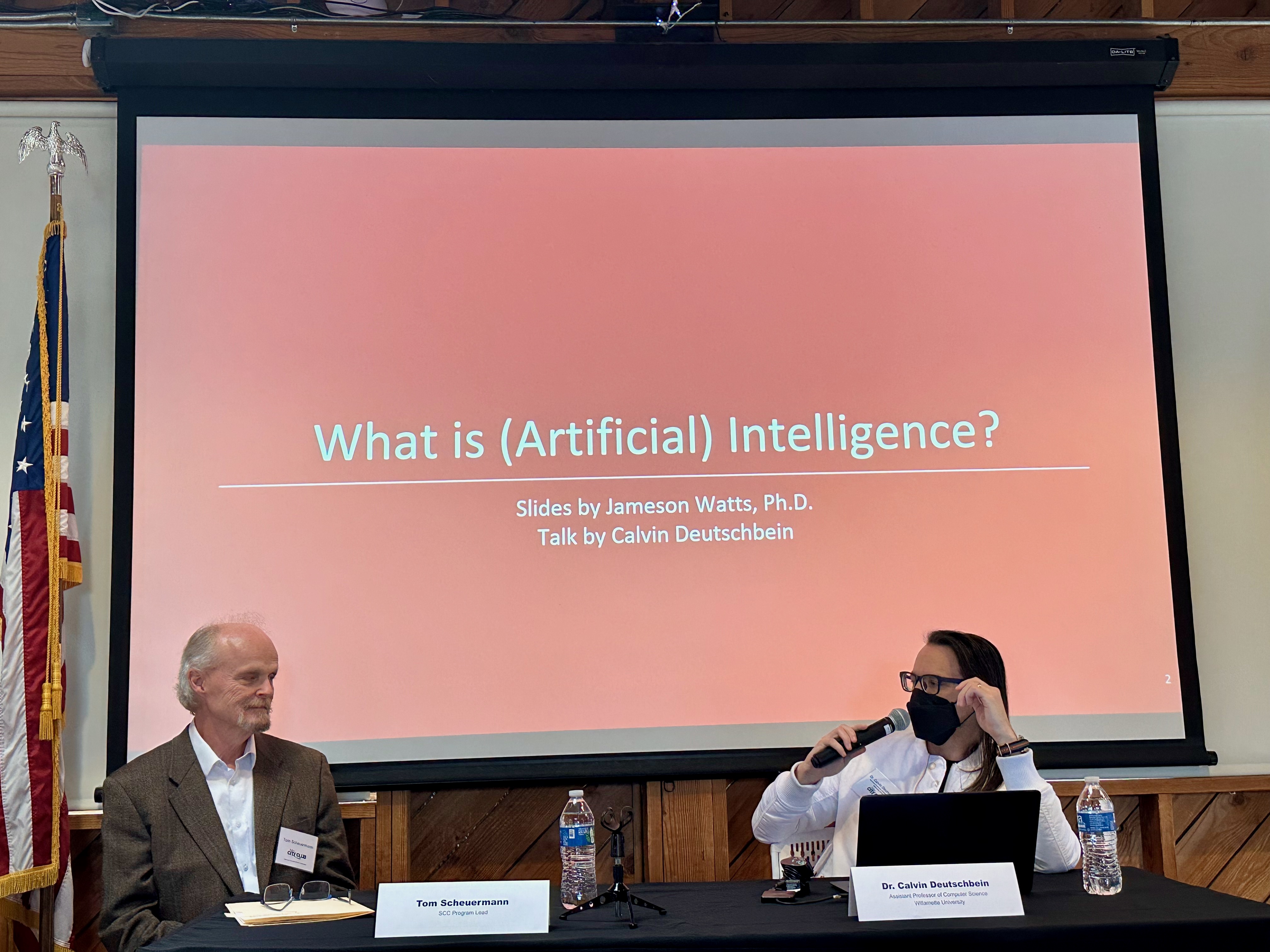 Last Friday Calvin Deutschbein, Assistant Professor of Computer Science at Willamette University, gave a talk on Artificial Intelligence, otherwise known as AI, to the Salem City Club. Deutschbein is holding a microphone in the photo below.