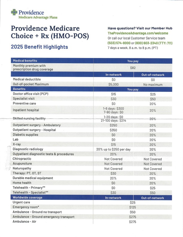 Providence is playing some disturbing games with the information they're giving, and withholding, from people who either have their Choice Medicare Advantage plan or are inquiring about it. The Providence web page for 2025 plans matching my zip code led me to this page about the Choice + Rx (HMO-POS) plan that I have.