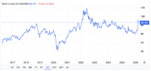 Gasoline prices have been on peoples’ minds lately, given how the war with Iran that Trump started for some dubious reasons has caused the price of Brent Crude Oil to shoot up markedly, as shown in this 10 year chart provided by the Trading Economics site. Our neighborhood gas station here in Salem, Oregon is charging $4.25 a gallon, last time I looked.
